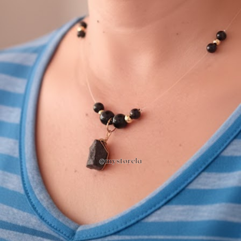 • Materiales: Nailon transparente, Turmalina negra natural (bruta y pulida), Oro laminado.