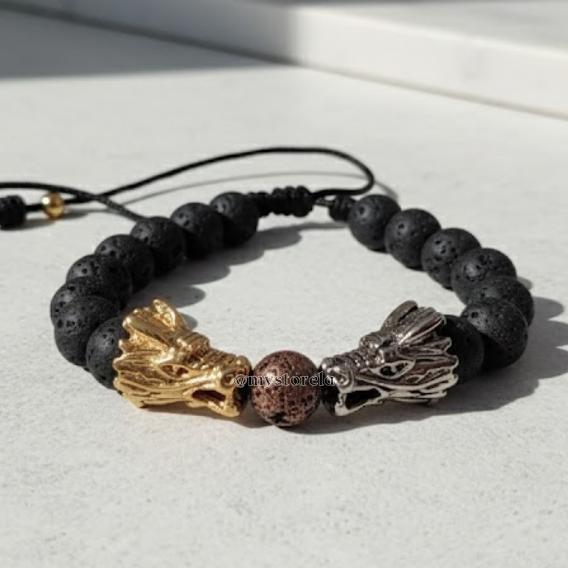 Detalle Central: Las cabezas de dragón flanquean una cuenta de piedra volcánica en tono terracota, creando un punto de contraste visual único.
